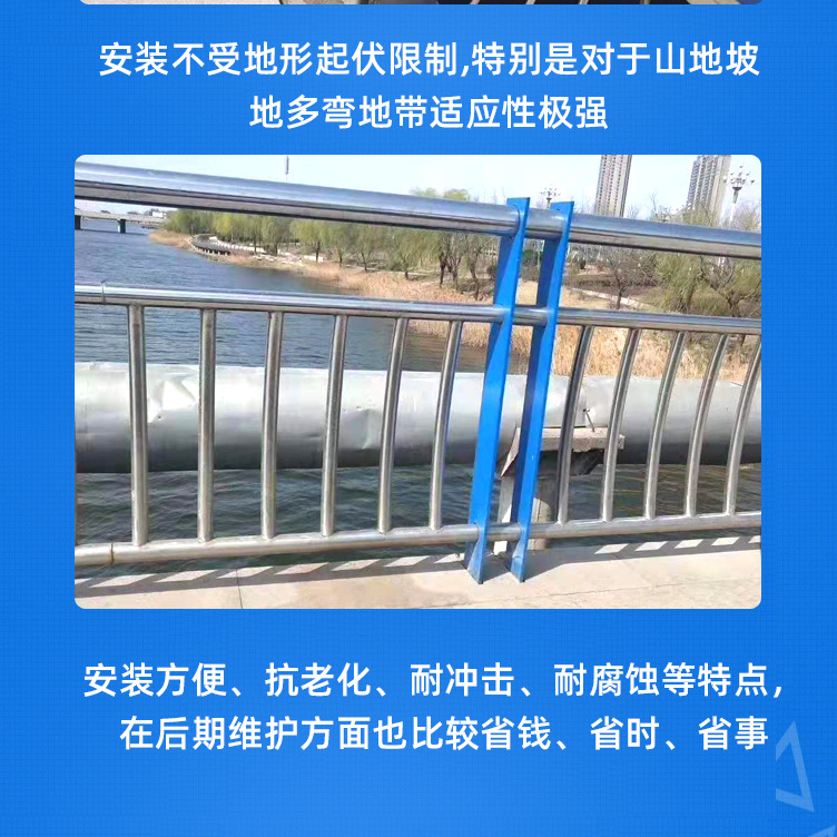 河道護欄不僅具有不銹鋼管的豪華美觀和現(xiàn)代氣息,又具有普通碳鋼管的堅韌性。是價昂不銹鋼管的替代品,它與鋼板立柱配合,做成城市、道橋等的安全欄桿。 不僅牢固、大方,且可造型各異,給都市別一種亮麗風景線。